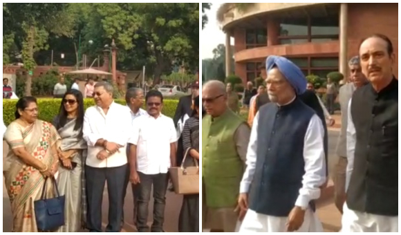 সংবিধান দিবসের শুরুতেই প্রতিবাদের মুখোমুখি বিজেপি। সেই অনুষ্ঠানকে বয়কট করে মঙ্গলবার সকালেই সংসদের আম্বেদকর মূর্তির তলায় বিক্ষোভ দেখায় কংগ্রেস, নেতৃত্বে সোনিয়া গান্ধি। কংগ্রেসের সঙ্গেই যোগ দেয় তৃণমূল কংগ্রেস, শিবসেনার সাংসদরা। মহারাষ্ট্রের উদাহরণ তুলে ধরে সকলে বলেন, কেন্দ্র সরকার গণতন্ত্রকে খুন করছে, দেশের সংবিধানকে রক্তাক্ত করছে। তার প্রতিবাদেই এই ধরণা।