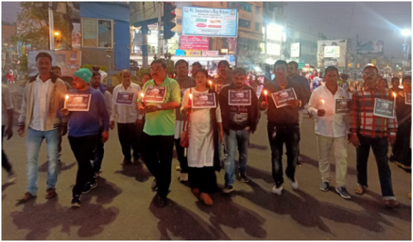 গোটা দেশ যেভাবে প্রতিবাদে গর্জে উঠেছে, সেভাবে এবার হায়দরাবাদ ধর্ষণ-খুন কাণ্ডে গর্জে উঠেছে বারাকপুর। হায়দরাবাদ ধর্ষণ-খুন কাণ্ডের প্রতিবাদে বারাকপুরে এক মোমবাতি মিছিল হয়। তৃণমূল যুবনেতা সম্রাট তপাদারের নেতৃত্বে এই মিছিল হয়। বারাকপুর স্টেশন থেকে বারাকপুরে গান্ধী মূর্তির পাদদেশে এই প্রতিবাদ মিছিল হয়।