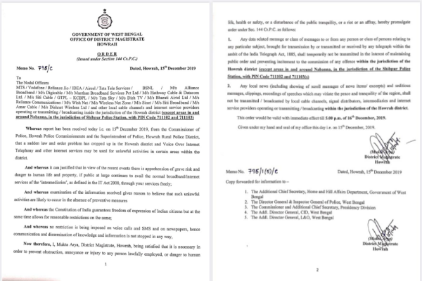 হাওড়ায় জেলা শাসকের একটি চিঠি আপাতত চর্চায়। এটি সত্য কিনা খোঁজ চলছে। তিনি এই নির্দেশে মোবাইল সার্ভিস প্রোভাইডার, নেট ও খবরের চ্যানেলে নজরদারির ইঙ্গিত দিয়েছেন। উত্তেজনাপ্রবণ কিছু দেখানো যাবে না। গ্রুপ এস এম এস চলবে না। নবান্ন অঞ্চলকে ছাড় দিয়ে এই নিষেধাজ্ঞা থাকবে। পুলিশের রিপোর্টের ভিত্তিতেই এই কাজ হচ্ছে। শান্তি বিঘ্নিত হওয়া কোনো খবর চলবে না। এদিকে এর কোনো সংজ্ঞা বলা নেই। তাহলে কি হামলা হলেও সেই খবর ও ছবি দেখানো যাবে না? হাওড়ার এই চিঠি সত্য কিনা খোঁজ চলছে। প্রশ্ন হল তাহলে কি অন্য জেলাতেও এটা হচ্ছে? উত্তর মেলেনি। তবে এটা ঠিক যে উত্তেজনা ছড়ানো থামাতে দায়িত্বজ্ঞানহীন কিছু প্রচার থামানো দরকার। কিন্তু তা করতে গিয়ে ঘটনা চেপে দেওয়া কি ঠিক হবে?