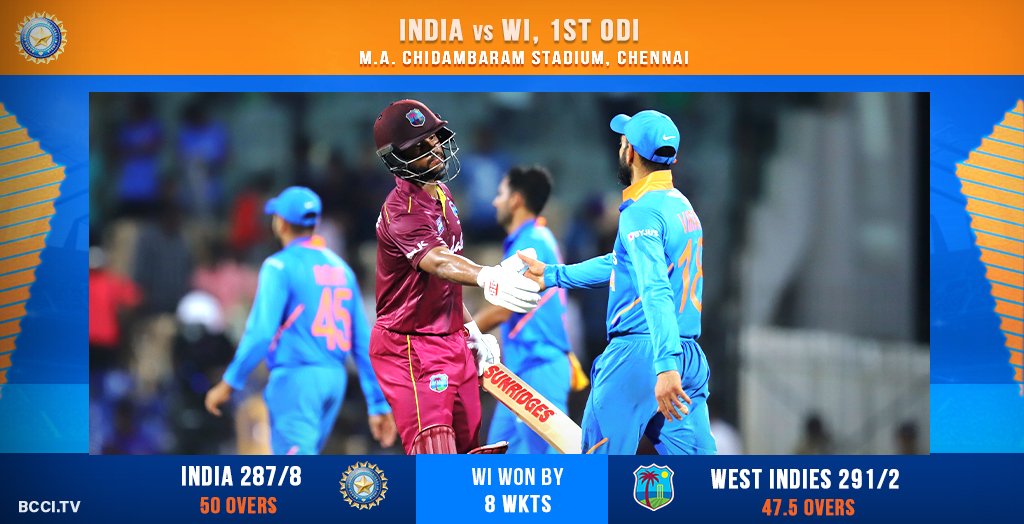 এদিন শুরুটা ভাল হয়নি কোহলিদের। খেলা শুরু হওয়ার আগেই বোঝা গিয়েছিল চেন্নাইয়ের স্লো উইকেটে সমস্যায় পড়বেন স্ট্রোক প্লেয়াররা। হলও তাই। রান পেলেন না ভারতের প্রধান তিন ব্যাটসম্যান। রোহিত শর্মা (৩৬), বিরাট কোহলি (৪) ও লোকেশ রাহুল (৬) রান না পেলেও ভারতের মিডল অর্ডার সামলে নেয়। শ্রেয়স আইয়ার (৭০), ঋষভ পন্থ (৭১) ও কেদার যাদবের (৪০) ব্যাটিংয়ে ম্যাচে ফেরে ভারত। প্রথমে ব্যাট করে ওয়েস্ট ইন্ডিজের বিরুদ্ধে ৮ উইকেটে ২৮৭ রান তোলে ভারত।