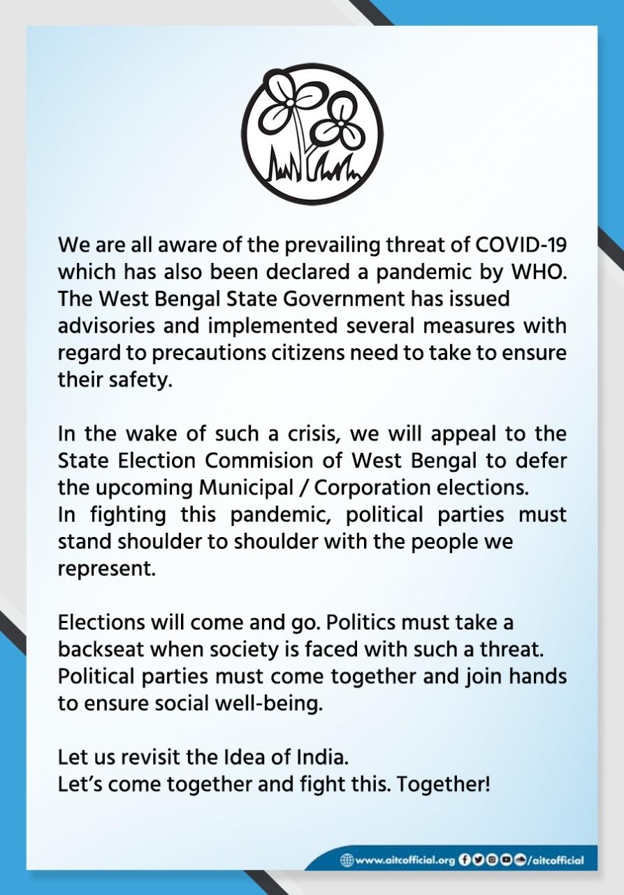 তৃণমূলের বক্তব্য, ভোট আসবে ভোট যাবে। কিন্তু করোনা আতঙ্ক যেভাবে মানুষের মধ্যে ভীতির সঞ্চার করেছে, সেটাকে আগে দূর করা প্রয়োজন। তাই প্রয়োজনে ভোটের রাজনীতির ঊর্ধ্বে উঠে, আগে করোনা মোকাবিলা প্রয়োজন। তাই প্রয়োজনে ভোট পিছিয়ে যায় যাক, কিন্তু করোনা মোকাবিলায় রাজ্য নির্বাচন কমিশন থেকে শুরু করে বিরোধী দলগুলিকে আবেদন করেছে শাসক তৃণমূল।