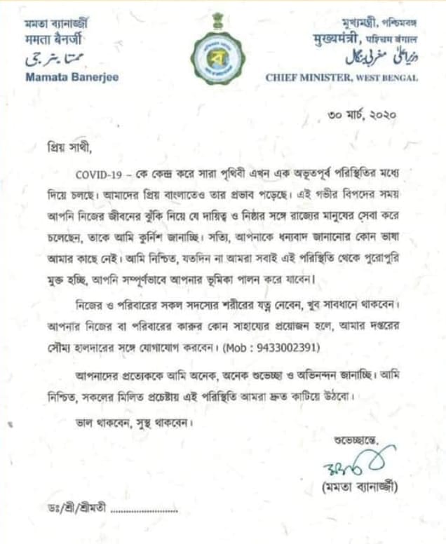 রাজ্যের মানুষের উদ্দেশ্যে তিনি বলেছেন, কারও নিজের বা পরিবারের যদি প্রয়োজন পড়ে, তাহলে সে যেন মুখ্যমন্ত্রীর দপ্তরের সঙ্গে যোগাযোগ করেন।