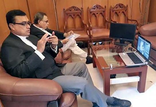 কলকাতা হাইকোর্টে স্কাইপ-শুনানি চলছে৷ এজলাশে বিচারপতি দীপঙ্কর দত্ত এবং বিচারপতি জয়মাল্য বাগচি৷ ( ছবি: হাইকোর্টের সৌজন্যে )