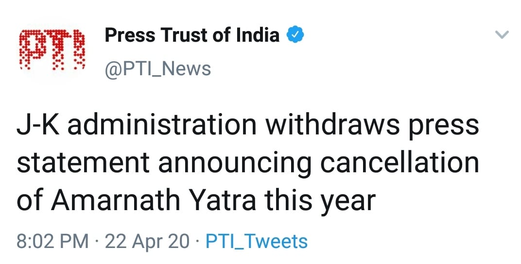 প্রসঙ্গত, করোনা থাবা বসানোর আগে থেকেই অবশ্য এবার অমরনাথ যাত্রা নিয়ে একটা সংশয় ছিল। কাশ্মীরে ৩৭০ ধারা প্রত্যাহারের পর পরিস্থিত স্বাভাবিক হবে কিনা তা নিয়ে জল্পনা চলছিল সব মহলে। অবশেষে উপ-রাজ্যপাল গিরিশচন্দ্র মূর্মূর নেতৃত্বে বোর্ড মিটিংয়ে স্থির হয়, ২৩ জুন অমরনাথ যাত্রা শুরু হবে। এবং যাত্রা শেষ হবে ৩ অগস্ট। কিন্তু এদিন হঠাৎ করে করোনা সঙ্কটের জেরে এ বছরের মতো অমরনাথ যাত্রা বাতিল কথা ঘোষণা করে জম্মু-কাশ্মীর প্রশাসন। আবার অদ্ভুতভাবে কিছুক্ষনের মধ্যেই তা প্রত্যাহার করে নেওয়া হবে। তবে ঠিক কী কারণে তা প্রত্যাহার করা হলো, সে ব্যাপারে স্থানীয় প্রশাসন বা কেন্দ্রের তরফে খোলসা করে কিছু জানানো হয়নি।