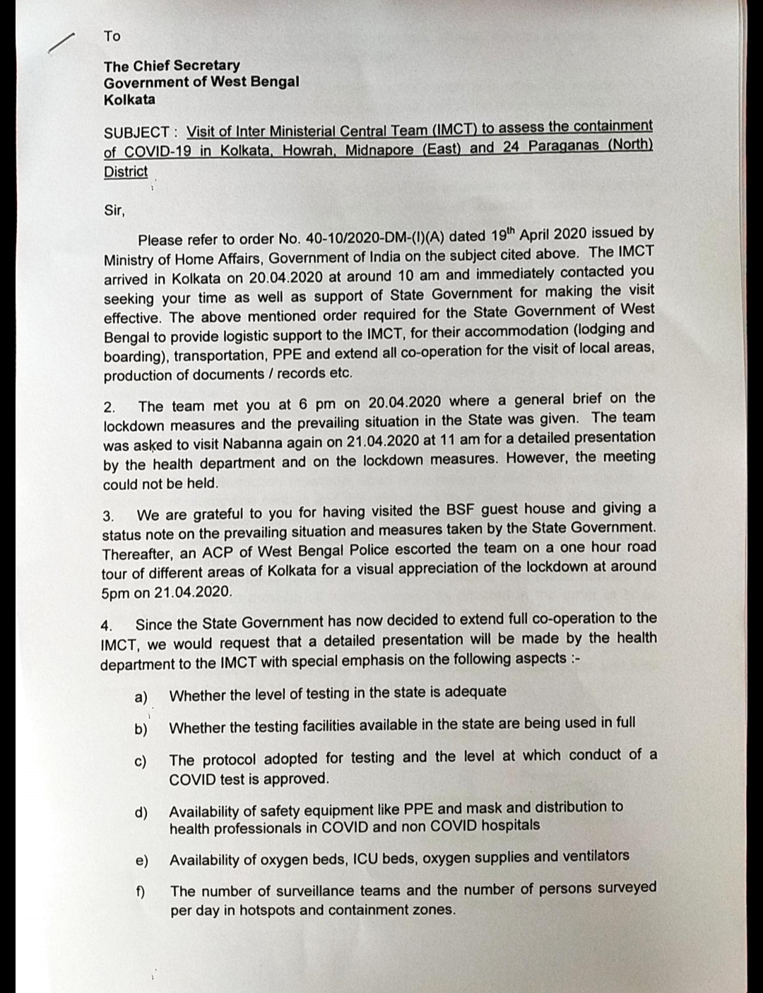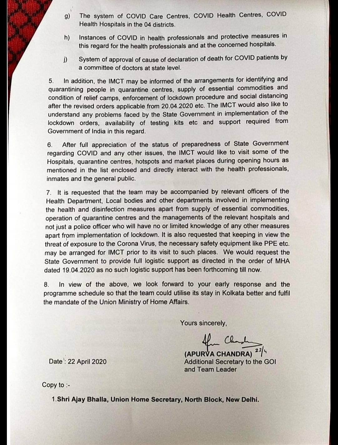 এর আগে মুখ্য সচিবকে চিঠি দেন কেন্দ্রীয় স্বরাষ্ট্র সচিব অজয় ভাল্লা। তাতে লেখা ছিল, ‘আপনাকে নির্দেশ দেওয়া হচ্ছে’ স্বরাষ্ট্র মন্ত্রকের পাঠানো ১৯ তারিখের নির্দেশ অনুযায়ী আন্তঃমন্ত্রক প্রতিনিধি দলের জন্য সমস্ত রকম প্রয়োজনীয় ব্যবস্থা করতে।