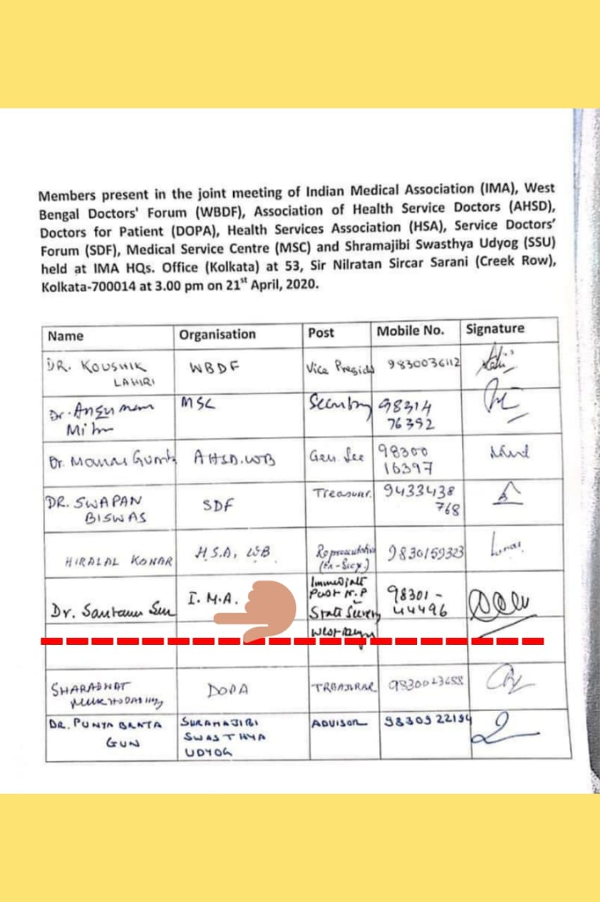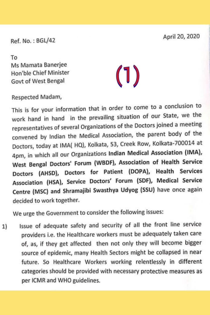 রাজ্যের চিকিৎসকদের ৮টি সংগঠন একযোগে মুখ্যমন্ত্রী মমতা বন্দ্যোপাধ্যায়কে ৪ পাতার একটি চিঠি লিখে করোনা-যোদ্ধা চিকিৎসক এবং স্বাস্থ্যকর্মীদের প্রয়োজনীয় নিরাপত্তা-সহ একাধিক দাবি জানিয়েছে৷ চিঠির একদম শেষে বলা হয়েছে, “একক লড়াই চালিয়ে এই যুদ্ধে সরকার জয়ী হতে পারবে না, যৌথভাবে লড়াই চালাতে হবে৷” এই চিঠিতে যারা সই করেছেন তাদের অন্যতম তৃণমূল সাংসদ শান্তনু সেন৷ ওদিকে টুইট করে এ রাজ্যের চিকিৎসকদের ৮টি সংগঠনের এই দাবিকে সমর্থন জানিয়েছেন বিজেপির আইটি সেলের চেয়ারম্যান অমিত মালব্য৷