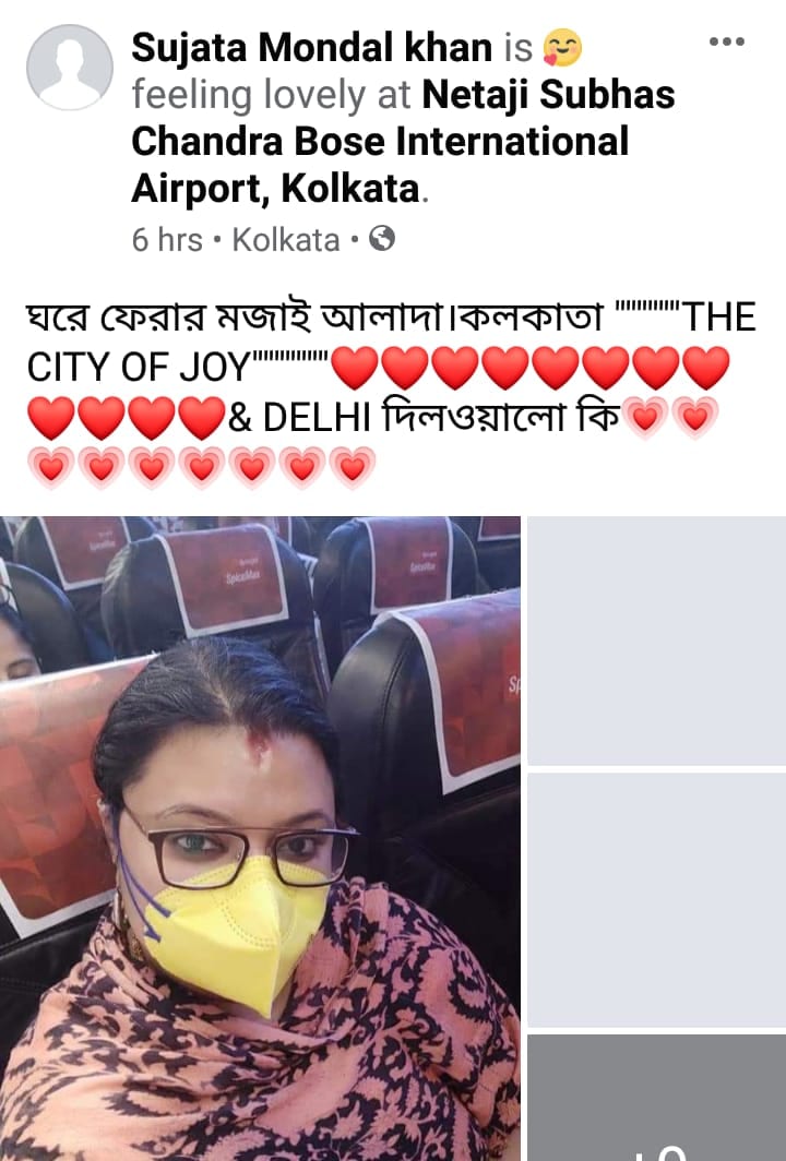 এই লকডাউনে যখন উড়ান বন্ধ রেখেছে কেন্দ্রের বিজেপি সরকার, ঠিক তখনই, বুধবার ফেসবুকে একাধিক ছবি পোস্ট করেছেন বিজেপি সাংসদ সৌমিত্র খানের স্ত্রী সুজাতা মণ্ডল খান৷ ছবির সঙ্গে লিখেছেন, “ঘরে ফেরার মজাই আলাদা, THE CITY OF JOY & DELHI দিলওয়ালো কি”৷ এই দু’লাইন লেখার মাঝে এই কঠিন সময়ে কেন্দ্রের শাসক দলের এক সাংসদের স্ত্রীর আনন্দের বহিঃপ্রকাশে রয়েছে একাধিক ♥, যা দিয়ে তিনি বুঝিয়েছেন, “feeling lovely” ৷ দেশ গোল্লায় যাক, ওনার চিত্তে এই মুহুর্তে সীমাহীন প্রেম৷