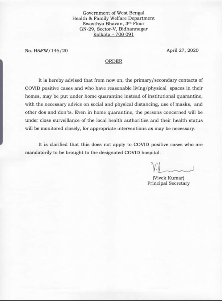 মুখ্যমন্ত্রীর ওই বক্তব্য নিয়ে বিতর্ক সৃষ্টি হওয়ায় সোমবার রাতেই জারি করা স্বাস্থ্য দফতরের নোটিসে বলা হয়েছে, করোনা পজিটিভ রোগীর প্রাইমারি বা সেকেন্ডারি কনট্যাক্টকেই শুধু মাত্র হোম কোয়ারেন্টাইনে রেখে চিকিত্সা করা যাবে৷ যদি সংশ্লিষ্ট ব্যক্তির বাড়িতে পর্যাপ্ত জায়গা বা ঘর থাকে৷ তা হলে সরকারি কোয়ারেন্টাইনে না-রেখে তাঁকে বাড়িতেই হোম কোয়ারেন্টাইনে রাখা হবে৷ সামাজিক দূরত্ব, মাস্কের ব্যবহার সহ যাবতীয় পরামর্শও মানতে হবে ওই ব্যক্তিকে৷ নোটিসে আরও বলা হয়েছে, হোম কোয়ারেন্টাইনে থাকলেও, সংশ্লিষ্ট ব্যক্তির শারীরিক অবস্থা স্বাস্থ্য দফতর মনিটরিং করবে, প্রয়োজনীয় যাবতীয় ব্যবস্থাও নেবে স্বাস্থ্য দফতর৷