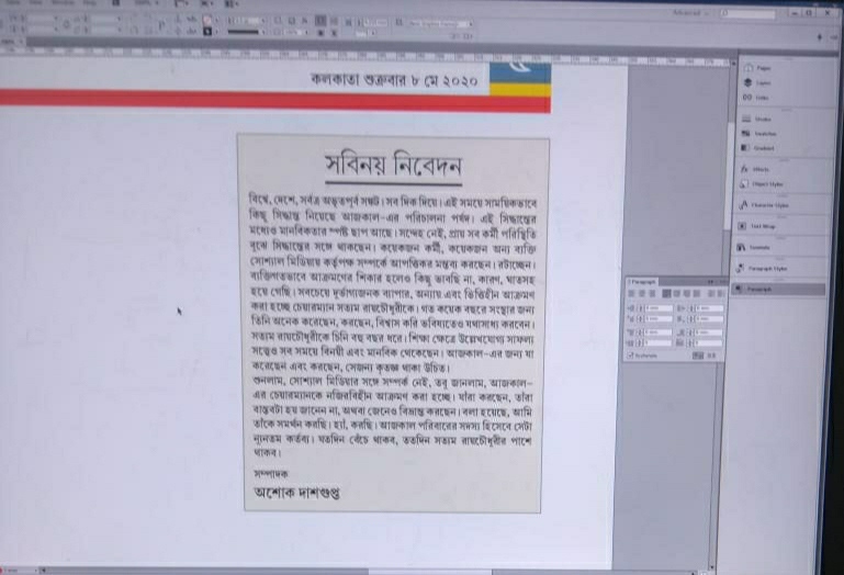 এদিকে আজকাল সম্পাদক অশোক দাশগুপ্ত এই পরিস্থিতিতে ইউনিয়নের ক্ষোভের মুখে পড়া চেয়ারম্যান সত্যম রায়চৌধুরীর পাশে দাঁড়িয়ে একটি কলম লিখেছেন। সেটি শুক্রবার প্রকাশিত হবে। কাগজের মেক আপ শুরু হয়েছে। লেখাটি আমরা এই কপির সঙ্গে তুলে দিলাম। রাতে যদি লেখা বা সিদ্ধান্ত না বদলায়, তাহলে এই লেখাটিই দিনের আলো দেখার কথা। অশোকবাবু এখানে পুরোপুরি সত্যমকে সমর্থন করেছেন। তিনি বলেছেন, প্রায় সব কর্মীই কর্তৃপক্ষের পাশে আছেন। সঙ্কটে সাময়িক কিছু সিদ্ধান্ত নিয়েছে কর্তৃপক্ষ।