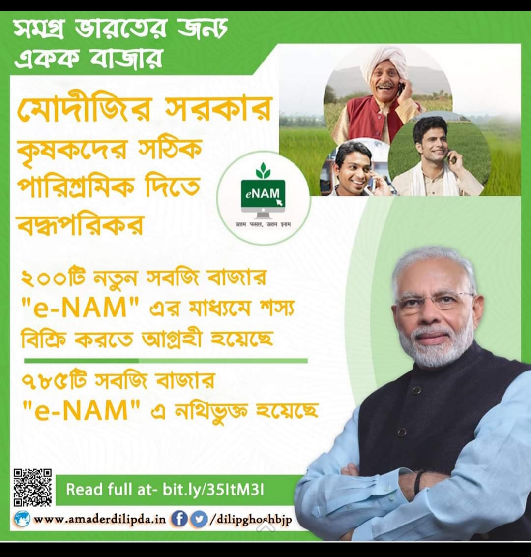 এ প্রসঙ্গে বিজেপির রাজ্য সভাপতি দিলীপ ঘোষ বলেন, এক দেশ এক বাজারের পথে এগোচ্ছে এবার ভারতবর্ষ। ‘ই- নাম’ তারই উল্লেখযোগ্য পদক্ষেপ। জনহিতকর এই প্রকল্পের মাধ্যমে উপকৃত হবেন কৃষক সম্প্রদায়। এর মাধ্যমে দেশের বিভিন্ন বাজারে সবজির দামের তারতম্য দূর হবে। মানুষ সমমূল্যে গোটা দেশের বিভিন্ন সবজি বাজার থেকে সবজি কিনতে পারবেন ।