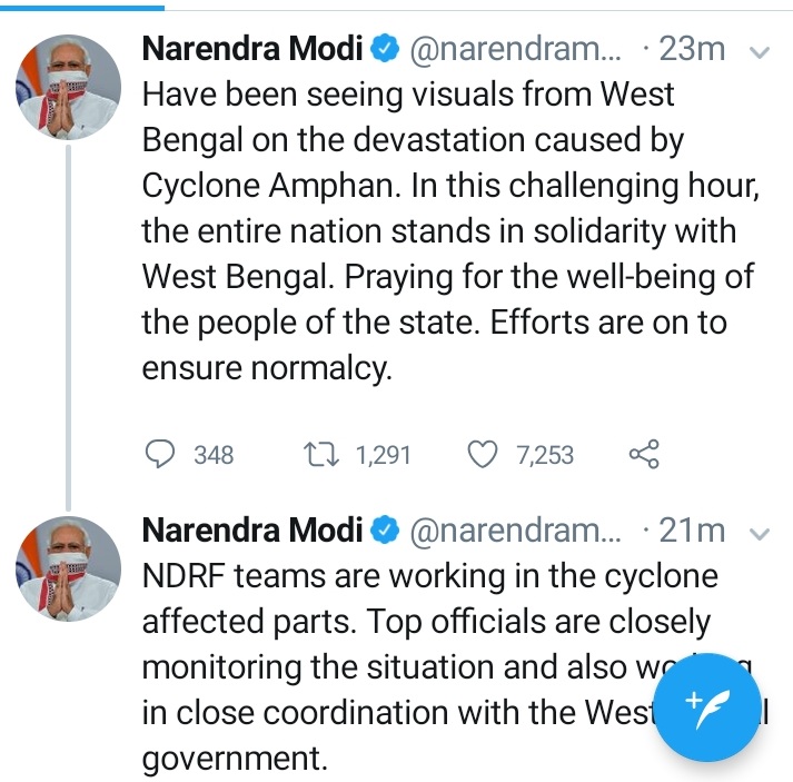 পশ্চিমবঙ্গে আমফানের ভয়াবহতা দেখে এবার মুখ খুললেন প্রধানমন্ত্রী নরেন্দ্র মোদি। বললেন, আমফানের ভয়াবহতা আমি নিজের চোখে দেখেছি। এই কঠিন সময়ে সময়ে সারাদেশ পশ্চিমবঙ্গের পাশে রয়েছে। প্রত্যেক পশ্চিমবঙ্গবাসী ভাল থাকুন, সুস্থ থাকুন। স্বাভাবিকতা ফিরিয়ে আনতে কাজ শুরু হয়ে গিয়েছে।