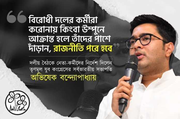“করোনা বা আমফানে যদি বিরোধী দলের কর্মী সমর্থকরাও আক্রান্ত হন, বিপন্ন হন, তাঁদের পাশে দাঁড়ান। সবরকম সহযোগিতা করুন। রাজনীতি পরে হবে।” যুব তৃণমূল কর্মীদের নির্দেশ দিয়েছেন সভাপতি অভিষেক বন্দ্যোপাধ্যায়। তাঁর স্পষ্ট কথা, “দলমত জাতিধর্ম না দেখে বিপদে পড়া মানুষের কাছে সবরকম পরিষেবা পৌঁছে দিতে হবে।”