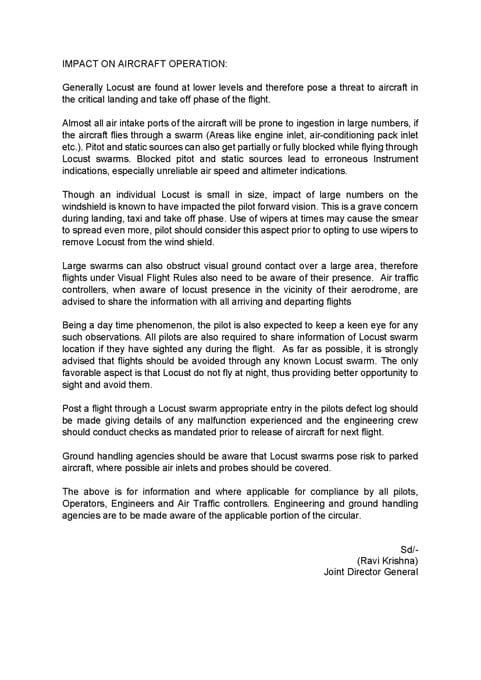 ওই নির্দেশিকায় আরও বলা হয়েছে, পঙ্গপালের দল অনেকটাই নিচু দিয়ে ওড়ে। এতে বিমানের ওঠানামায় সমস্যা হবে। বিমানের ইঞ্জিন সহ অন্যান্য অংশে ঢুকে পড়তে পারে পতঙ্গ। তাতে আবার বিপদ বাড়বে। পতঙ্গের ঝাঁকের মধ্যে দিয়ে বিমান চললে যন্ত্রাংশ বিকল হতে পারে। সমস্যা হবে বিমানের। এমনকী কন্ট্রোলরুমে যোগাযোগ বিচ্ছিন্ন হতে পারে। ফরে বড়সড় দুর্ঘটনার আশঙ্কা থাকছে।