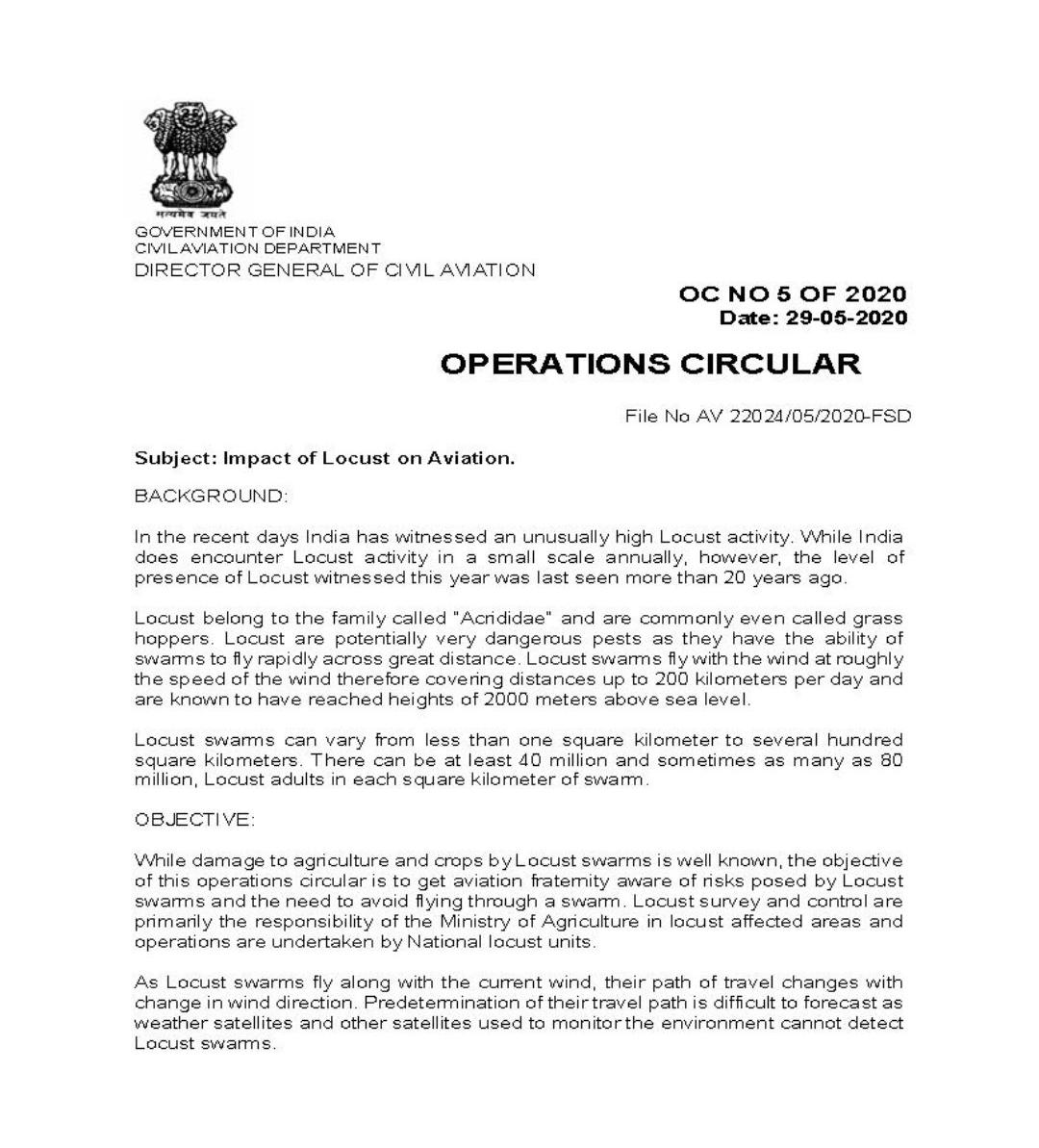 নির্দেশিকায় ডিজিসিএ জানিয়েছে, শুধুমাত্র শস্যের নয়, বিমানের ওঠানামাতেও বিঘ্ন ঘটাতে পারে এই পঙ্গপালের দল। তবে রাতে পঙ্গপালের দল উড়তে পারে না। এই তথ্য বিমান চালকদের স্বস্তি দিচ্ছে। কিন্তু যে হারে পঙ্গপালের হানা বাড়ছে তাতে পঙ্গপালের ঝাঁককে এড়িয়ে চলার পরামর্শ দিয়েছে ডিজিসিএ। ইতিমধ্যেই পশ্চিম ও মধ্য ভারতের বিস্তীর্ণ অঞ্চলজুড়ে পঙ্গপালের দাপট দেখা গিয়েছে। যার জেরে চিন্তার ভাঁজ কৃষকদের কপালে। রাজস্থান, পাঞ্জাব, হরিয়ানা, মধ্যপ্রদেশে কামড় বসিয়েছে পঙ্গপাল। উত্তরপ্রদেশেও ঢুকে পড়েছে তারা। ঝাঁসির উপর দিয়ে মহারাষ্ট্রের দিকে এগিয়ে যাচ্ছে পঙ্গপালের দল।