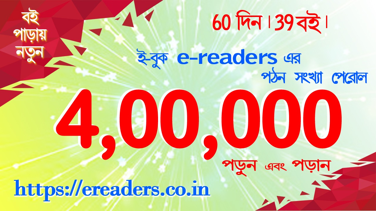 মাত্র ৬০ দিন। ৩৯টি বই। শেষ কদিন বিদ্যুৎবিভ্রাট ও নেটের সমস্যায় কাজ অনিয়মিত। তা সত্ত্বেও সাইটে হিট ৪ লক্ষ অতিক্রম করল ই-রিডার্স। বাংলা ই-বইতে এই লকডাউনের মধ্যেও নতুন পথ দেখাচ্ছে এই প্রকাশন। বিশ্বব্যাপী পাঠকপাঠিকারা সাড়া দিচ্ছেন। এই সাইটেই প্রকাশনা ও গন্থাগার।
