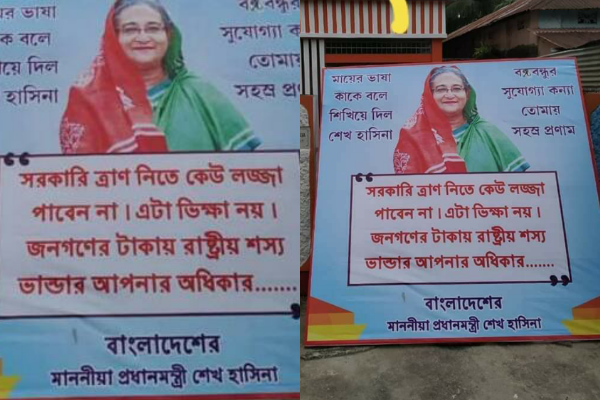 একটি পোস্টার ঘিরে চাঞ্চল্য ছড়াল কোচবিহার দিনহাটা মহকুমায়। বুধবার সকালে দিনহাটার এক নম্বর ওয়ার্ডে ভারত সেবা আশ্রমের সামনে বাংলাদেশের প্রধানমন্ত্রী শেখ হাসিনার ছবি দিয়ে একটি পোস্টার দেখেন এলাকাবাসী। সূত্রের খবর, এক নম্বর ওয়ার্ডের কাউন্সিলর তথা বর্তমান দিনহাটার বিধায়ক উদয়ন গুহ ছায়াসঙ্গী জয় ঘোষের কাউন্সিলরের কার্যালয়ে লাগানো ছিল পোস্টারটি। পোস্টার এর বয়ান অনুসারে, “মায়ের ভাষা কাকে বলে শিখিয়ে দিল শেখ হাসিনা, সরকারি ত্রাণ নিতে কেউ লজ্জা পাবেন না। এটা ভিক্ষা নয় জনগণের টাকায় রাষ্ট্রীয় শস্য ভান্ডার আপনার অধিকার”।
