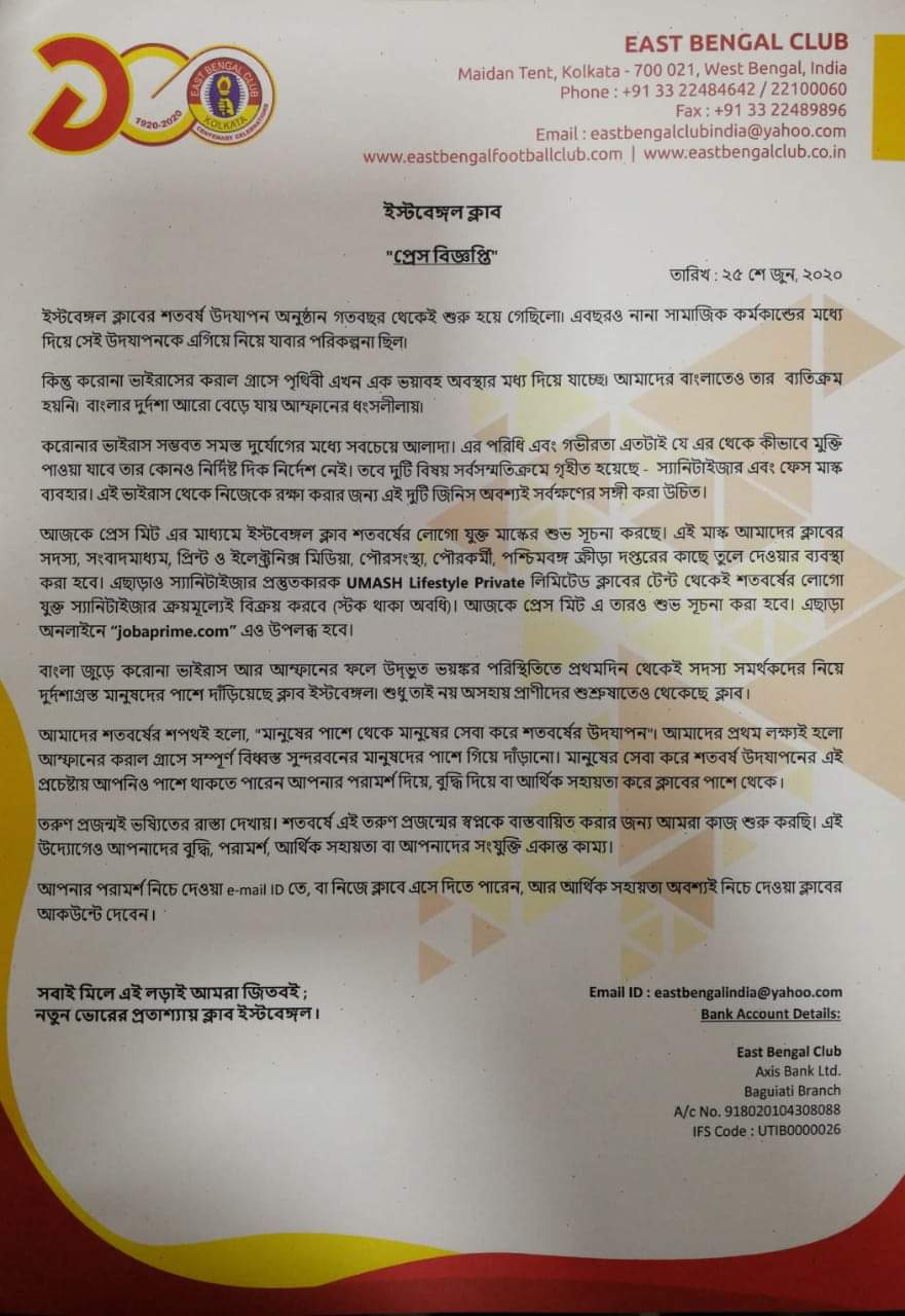 ফুটবল সাফল্যকে আপাতত দূরে সরিয়ে মহামারীর কথা মাথায় রেখে মানুষের পাশে দাঁড়াতে মাস্ক এবং স্যানিটাইজার বিলি করতে এগিয়ে এল ক্লাব কর্তৃপক্ষ। ক্লাবের শতবর্ষের লোগো দেওয়া দেড় লক্ষ মাস্ক বিলি করা হবে। স্যানিটাইজারেও থাকছে ক্লাবের শতবর্ষের লোগো।