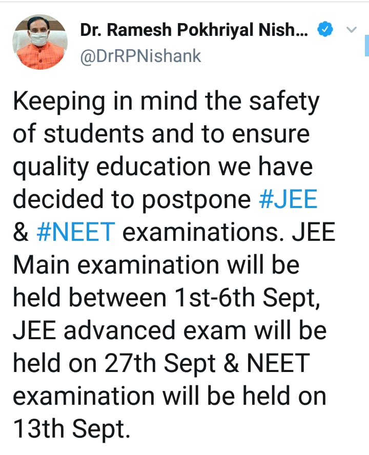 জুলাইতে হচ্ছে না জয়েন্ট এন্ট্রান্স পরীক্ষার (জেইই) মেইন ও ন্যাশেনাল এলিজিবিলিটি কাম এন্ট্রান্স পরীক্ষার (এনইইটি ২০২০)। এদিন কেন্দ্রীয় মানব সম্পদ উন্নয়ন মন্ত্রী রমেশ পোখরিয়াল বলেন, ১ থেকে ৬ সেপ্টেম্বরেরব মধ্যে অনুষ্ঠিত হবে জয়েন্ট এন্ট্রান্স পরীক্ষার (জেইই) মেইন। ১৩ সেপ্টেম্বর নিট। পাশাপাশি এদিন ঘোষণা করেন ২৭ সেপ্টেম্বর অনুষ্ঠিত হবে জয়েন্ট এন্ট্রান্স অ্যাডভান্স।