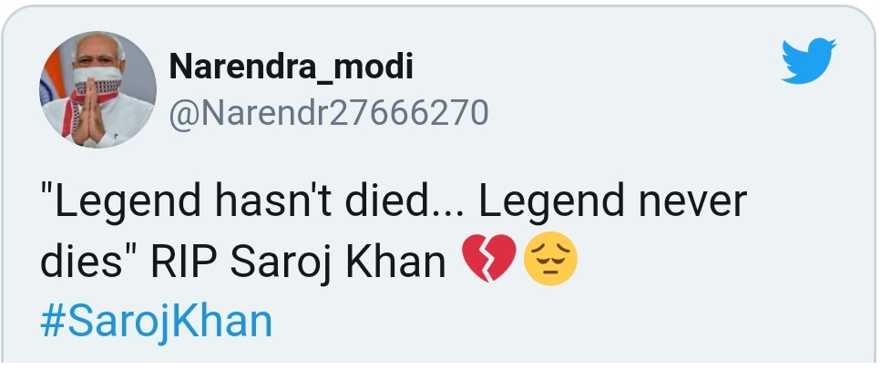 টুইট পোস্টে নরেন্দ্র মোদি লেখেন, “লেজেন্ডের কখনও মৃত্যু হয় না।” বলিউডে চার দশকের বেশি সময় ধরে জড়িত ছিলেন তিনি। দুহাজারের বেশি গানে কোরিওগ্রাফি করেছেন সরোজ। সালটা ১৯৭৪ । গীতা মেরা নাম ছবিতে কোরিওগ্রাফির মাধ্যমেই বলিউডে অভিষেক হয় সরোজ খান। একের পর এক ছবিতে কোরিওগ্রাফি করেছেন সরোজ। তিন বার জাতীয় পুরস্কার জয়ী কিংবদন্তীর মৃত্যুতে শোকের ছায়া নেমে এসেছে বলিউডে।