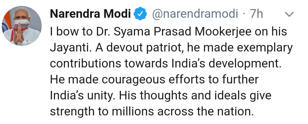 এদিন এক টুইট বার্তায় মোদি বলেন, “শ্যামাপ্রসাদ মুখোপাধ্যায়কে বিনম্র শ্রদ্ধা জানাই। তাঁকে প্রণাম জানাই। শ্যামাপ্রসাদ মুখোপাধ্যায় প্রকৃত অর্থে ভারতের এক নিষ্ঠাবান দেশপ্রেমিক। অখণ্ড ভারতের জন্য তাঁর লড়াই অনস্বীকার্য। তাঁর ভাবনা-আদর্শ-একতার বাণী-সাহসিকতা আমাদের জীবনে চলার পথে পাথেয়। শ্যামাপ্রসাদ মুখোপাধ্যায়ের অবদান দেশের লাখো লাখো মানুষের মধ্যে শক্তি জোগায়”।