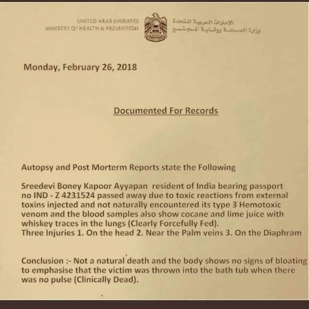 সম্প্রতি আরব আমিরশাহীর স্বাস্থ্যমন্ত্রকের একটি ময়নাতদন্তের রিপোর্টে শ্রীদেবীর মৃত্যু নিয়ে চাঞ্চল্যকর দাবি করা হয়েছে। অভিনেত্রী মারা গিয়েছিলেন ২৪ ফেব্রুয়ারি ২০১৮ এবং রিপোর্টটি তৈরি হয়েছিল ২৬ ফেব্রুয়ারি ২০১৮তে। এখানে জানানো হয়েছে, বিষক্রিয়াতেই মৃত্যু হয়েছে অভিনেত্রীর। রক্তের নমুনায় রয়েছে কোকেন এবং লেবুর জ্যুস। সেই সঙ্গে ফুসফুসে হুইস্কির নমুনা মেলে। এছাড়া শরীরে তিনটি আঘাতের চিহ্নও ছিল, যার একটি মাথায়, দ্বিতীয় প্লাম ভেইন এবং তৃতীয় ফুসফুসের মধ্যে ডায়াফ্রাগ্রামে। এর থেকেই নিশ্চিত যে মৃত্যু স্বাভাবিক নয়। মৃত্যুর নিশ্চিত হওয়ার পরেই তাঁকে ফেলে রাখা হয়েছিল বাথটবে। যদিও এই রিপোর্টের কোনওরকম সত্যতা যাচাই করেনি ‘এখন বিশ্ব বাংলা সংবাদ’।