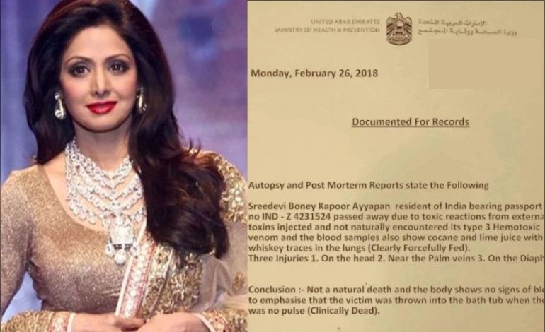 সম্প্রতি আরব আমিরশাহীর স্বাস্থ্যমন্ত্রকের একটি ময়নাতদন্তের রিপোর্টে শ্রীদেবীর মৃত্যু নিয়ে চাঞ্চল্যকর দাবি করা হয়েছে। অভিনেত্রী মারা গিয়েছিলেন ২৪ ফেব্রুয়ারি ২০১৮ এবং রিপোর্টটি তৈরি হয়েছিল ২৬ ফেব্রুয়ারি ২০১৮তে। এখানে জানানো হয়েছে, বিষক্রিয়াতেই মৃত্যু হয়েছে অভিনেত্রীর। রক্তের নমুনায় রয়েছে কোকেন এবং লেবুর জ্যুস। সেই সঙ্গে ফুসফুসে হুইস্কির নমুনা মেলে। এছাড়া শরীরে তিনটি আঘাতের চিহ্নও ছিল, যার একটি মাথায়, দ্বিতীয় প্লাম ভেইন এবং তৃতীয় ফুসফুসের মধ্যে ডায়াফ্রাগ্রামে। এর থেকেই নিশ্চিত যে মৃত্যু স্বাভাবিক নয়। মৃত্যুর নিশ্চিত হওয়ার পরেই তাঁকে ফেলে রাখা হয়েছিল বাথটবে। যদিও এই রিপোর্টের কোনওরকম সত্যতা যাচাই করেনি ‘এখন বিশ্ব বাংলা সংবাদ’।