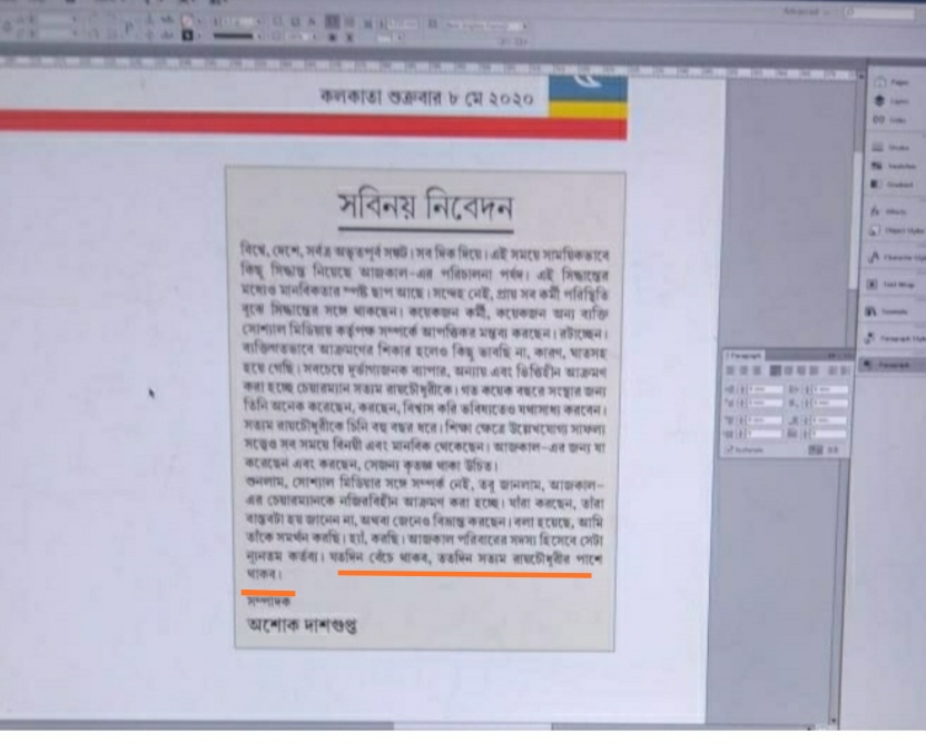 আজকাল পত্রিকা সংক্রান্ত জটিলতায় সম্পাদক অশোক দাশগুপ্ত হঠাৎ বিশেষ কলম ধরলেন চেয়ারম্যান সত্যম রায়চৌধুরীর সমর্থনে। বুঝিয়ে দিলেন ( বোঝানোর দরকার পড়ল) সত্যমের বিরুদ্ধে যে কর্মীরা সরব, তার পিছনে তিনি নেই। এতটাই জরুরি পরিস্থিতি যে সম্পাদককে কলম লিখতে হল।