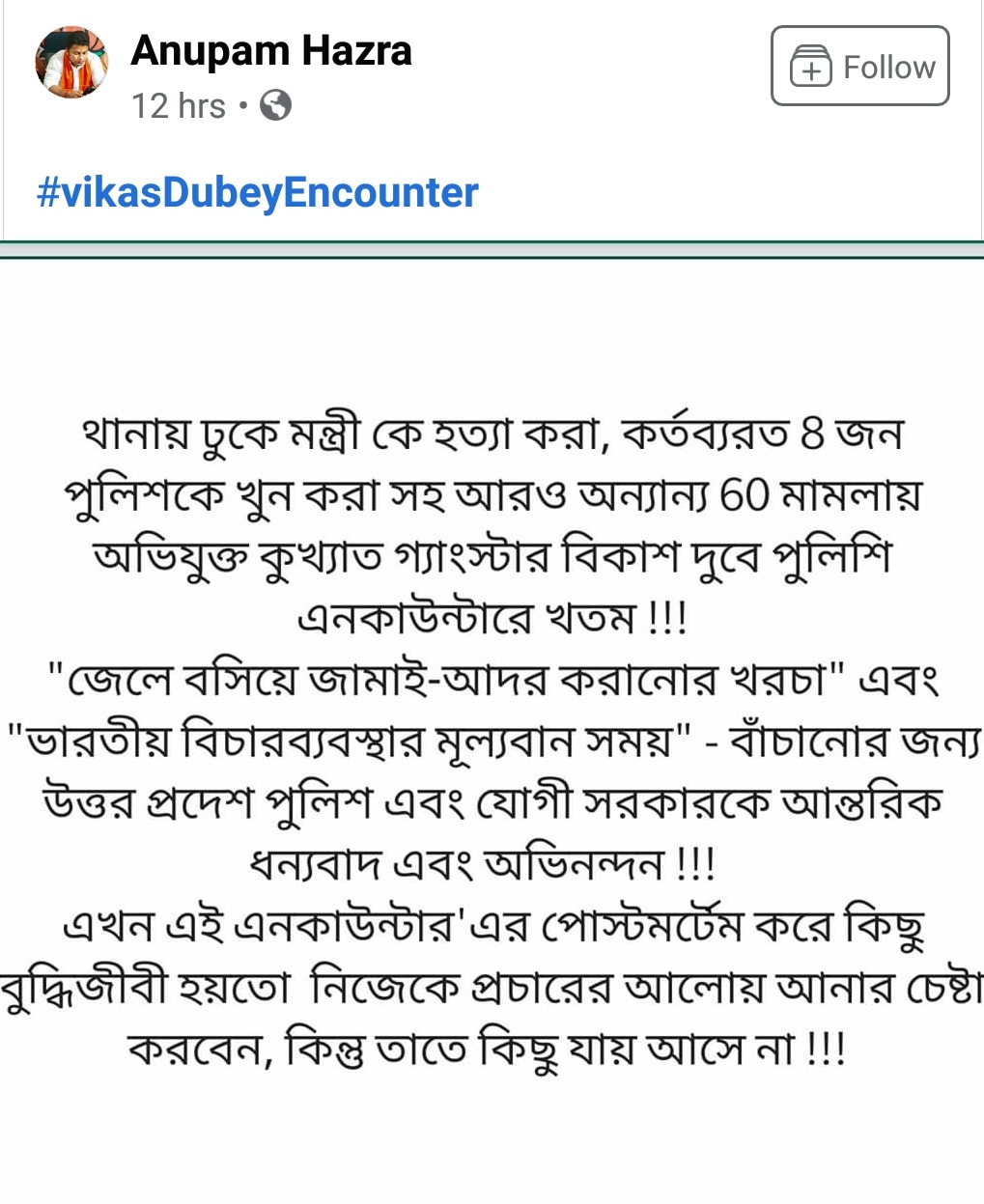 কিন্তু বিকাশ এনকাউন্টারের পর উত্তরপ্রদেশ পুলিশ ও মুখ্যমন্ত্রী যোগী আদিত্যনাথের সরকারকে ধন্যবাদ জানিয়েছেন বঙ্গ বিজেপি নেতা অনুপম হাজরা।