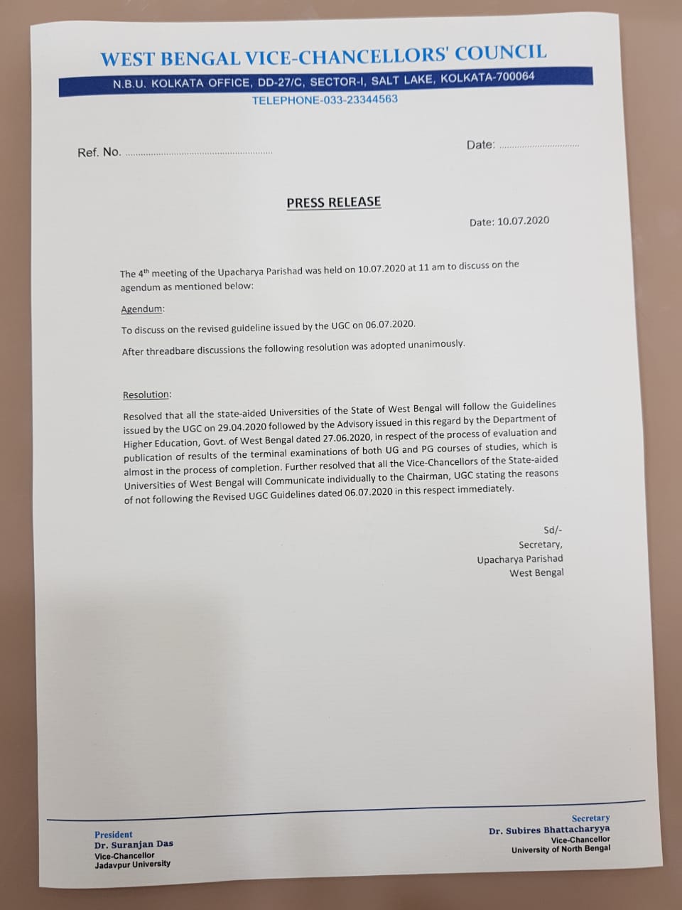উপাচার্য পরিষদ জানিয়ে দিয়েছে, এদিন উপাচার্য পরিষদের বৈঠকে সিদ্ধান্ত হয়েছে সেপ্টেম্বরের মধ্যে পরীক্ষা নেওয়ার সিদ্ধান্ত তাঁরা মানবেন না। আগের পরীক্ষায় পাওয়া নম্বরের ভিত্তিতে আশি শতাংশ ও ইন্টার্নাল অ্যাসেসমেন্টের উপর কুড়ি শতাংশ নম্বর দেওয়ার সুপারিশ করেছে এ রাজ্যের সরকার। তা মান্যতা দেওয়া হবে।