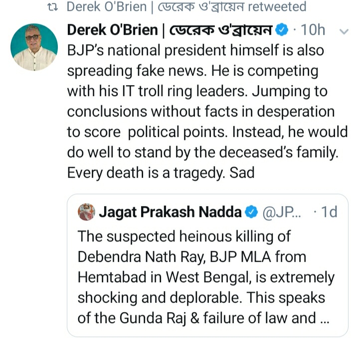 বিজেপি সভাপতি জে পি নাড্ডা আসলে আইটি সেলের ট্রোল রিংয়ের নেতা। বক্তা তৃণমূল সাংসদ ডেরেক ও ব্রায়েন। ডেরেকের অভিযোগ, বিজেপির সর্বভারতীয় সভাপতি ভুয়ো খবর ছড়াচ্ছেন। নাড্ডা ভুয়ো খবর ছড়ানোর প্রতিযোগিতায় নেমেছেন। আপনি আজেবাজে না বকে মৃতের পরিবারের পাশে দাঁড়ান। ডেরেক বলেন, প্রতিটা মৃত্যুই ট্র্যাজেডি এবং দুঃখের। কিন্তু তা নিয়ে রাজনীতি কেন? নাড্ডার অভিযোগ, বিজেপি বিধায়ক হেমেন্দ্রনাথ রায়কে খুন করে ঝুলিয়ে দেওয় হয়েছে। আর এর পিছনে রয়েছে তৃণমূল কংগ্রেস। তার জেরেই এ কথা বলেন তৃণমূলের রাজ্যসভার দলনেতা।