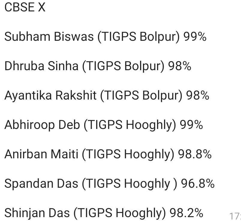 এছাড়াও সিঞ্জন দাস, অনির্বাণ মাইতি, ধ্রুব সিনহা, অয়ন্তিকা রক্ষিত, স্পন্দন দাসও টেকনো ইন্ডিয়া বিভিন্ন জেলার স্কুল থেকে ৯৬ শতাংশের উপরে নম্বর পেয়েছেন সিবিএসই দশমে।