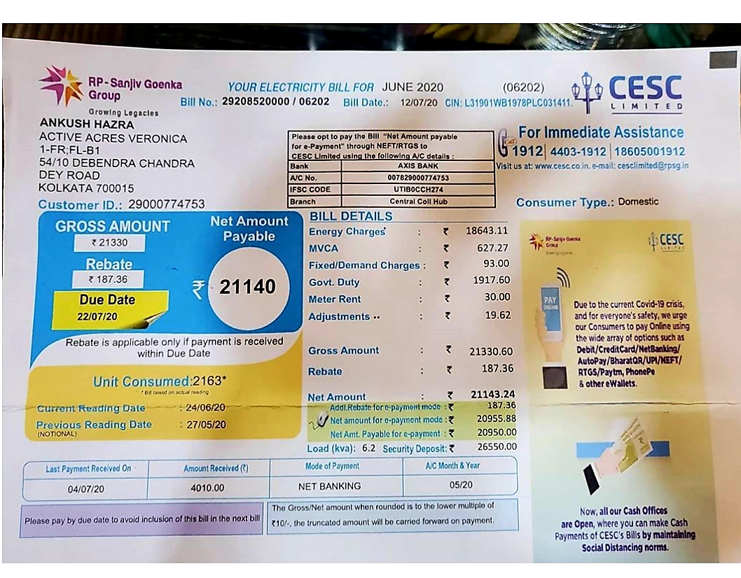 এই অবস্থায় অঙ্কুশের বাড়িতে মোটাসোটা অঙ্কের বিদ্যুৎ বিল পাঠিয়েছে সিইএসসি। সাধারণত প্রতি মাসে গড়ে হাজার চারেক টাকা বিল হয় তাঁর বিদ্যুৎ খরচের, জানিয়েছেন খোদ অঙ্কুশ। কিন্তু তার জায়গায় ২১ হাজারের উপরে বিল পাঠানোর কোনও যুক্তি খুঁজে পাচ্ছেন না তিনি।