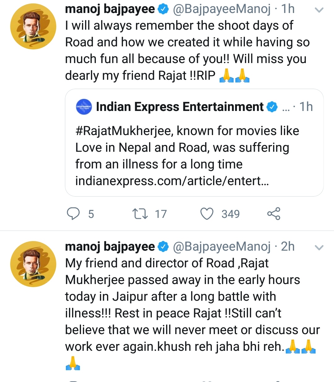 পারিবারিক সূত্রে খবর, দীর্ঘদিন ধরেই কিডনির সমস্যায় ভুগছিলেন “প্যার তুনে কেয়া কিয়া” খ্যাত এই পরিচালক। সম্প্রতি চিকিৎসাধীন ছিলেন হাসপাতালে। হয়েছিল ডায়ালিসিসও। আজ ট্যুইট করে “রোড” ছবির পরিচালক রজত মুখোপাধ্যায়ের মৃত্যু সংবাদ জানালেন সেই ছবিরই অভিনেতা তথা বন্ধু মনোজ বাজপেয়ী। এই দুটি ছবি ছাড়াও বেশ কিছু ছবি পরিচালনা করেছিলেন রজত মুখোপাধ্যায়। সেগুলির মধ্যে উল্লেখযোগ্য, “লাভ ইন নেপাল” “উম্মিদ”।