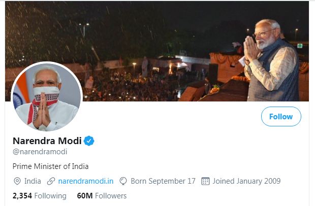 গুজরাতের মুখ্যমন্ত্রী থাকাকালীন টুইটার ব্যবহার শুরু করেন নরেন্দ্র মোদি। ২০১৪ সালে প্রধানমন্ত্রী হওয়ার পর রেকর্ড হারে বাড়তে থাকে ফলোয়ার্স সংখ্যা। এবার সেই ফলোয়ার্স সংখ্যা গিয়ে দাঁড়াল ৬ কোটিতে।