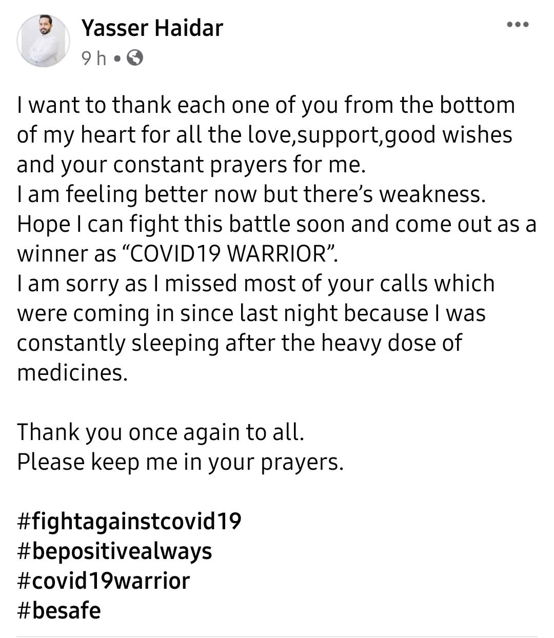 এমন একজন প্রাণচঞ্চল যুবক নিজের ফেসবুক পেজে লিখেছেন, কড়া ওষুধের প্রভাবে আপাতত বেশিরভাগ সময়েই ঘুমোচ্ছেন। তাই বেশিরভাগ ফোনকলই গ্রহণ করতে পারছেন না। তবে আপাতত তিনি ভাল আছেন। পোস্টে তিনি লেখেন, “আশা করি আমি শীঘ্রই এই যুদ্ধ জয় কররব এবং ‘কোভিড যোদ্ধা′ হিসেবে বিজয়ী হব।” তাঁর দ্রুত আরোগ্য কামনা করে আত্মীয়-বন্ধুরা যে প্রার্থনা করছেন, তার জন্য সকলকে আন্তরিকভাবে ধন্যবাদ জানিয়েছেন তিনি।