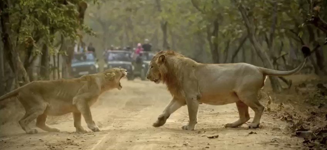 জঙ্গল পরিদর্শন বেরিয়ে হঠাৎই তাদের সঙ্গে দেখা। রাস্তা জুড়ে লড়াইয়ে ব্যস্ত এক সিংহ এবং সিংহী। তাতে থামিয়ে দিতে হলো পর্যটকদের গাড়ি। সোশ্যাল মিডিয়ায় এমনই এক ভিডিও ভাইরাল হয়েছে।