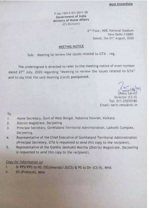 আমন্ত্রিত দুপক্ষ বেঁকে বসায় গোর্খাল্যান্ড টেরিটোরিয়াল অ্যাডমিনিস্ট্রেশন (জিটিএ) নিয়ে প্রস্তাবিত ত্রিপাক্ষিক বৈঠক স্থগিত করে দিতে হল কেন্দ্রকে। ১ অগাস্ট, শনিবার কেন্দ্রীয় স্বরাষ্ট্র মন্ত্রকের পাঠানো এক চিঠিতে ওই বৈঠক স্থগিত করার বিষয়টি রাজ্য সরকার ও জিটিএ-কে জানানো হয়েছে। তবে বৈঠক বাতিল হলেও ফের গোর্খাল্যান্ডের দাবির বিষয়টিকে সামনে চলে এসেছে। যা কি না আগামী বিধানসভা ভোটে সব রাজনৈতিক দলই কাজে লাগাতে সক্রিয় হয়ে উঠেছে।