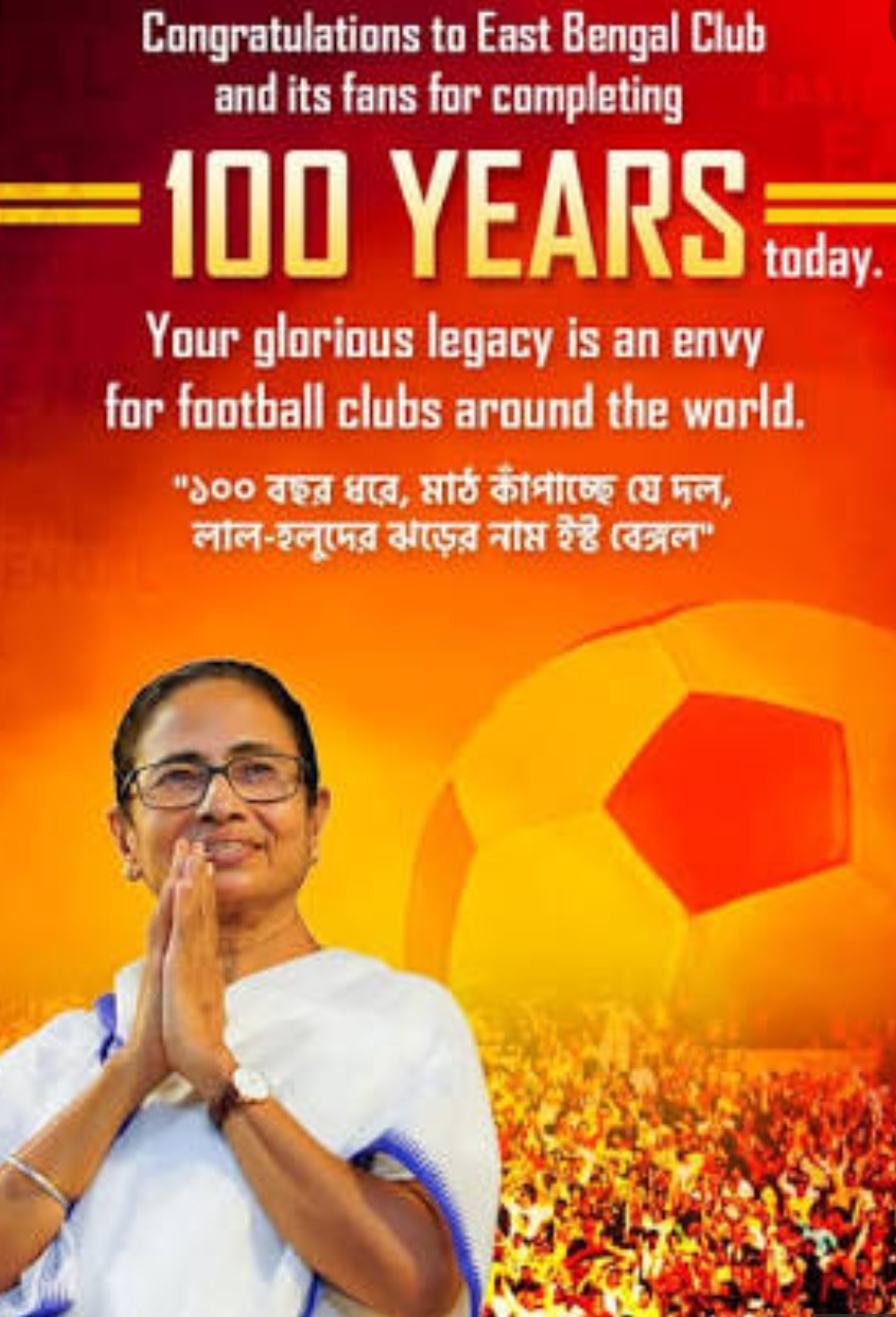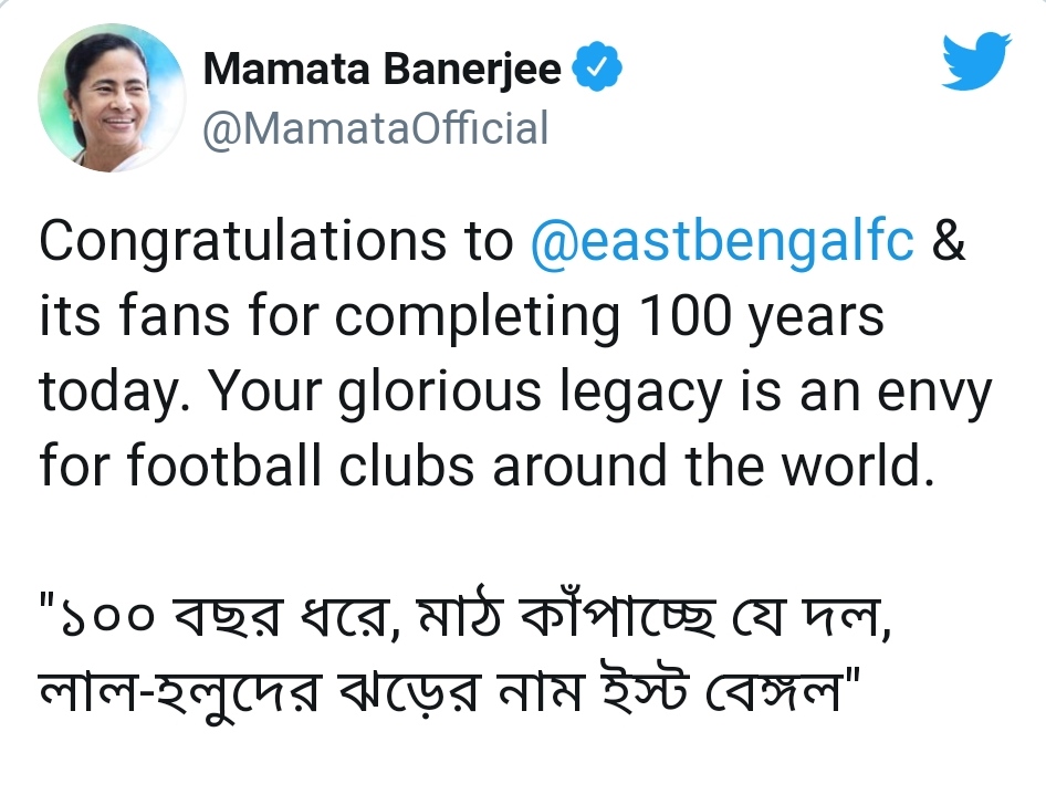 তবে ইস্টবেঙ্গলের জন্য ভেরি ভেরি স্পেশাল ছিল রাজ্যের ক্রীড়াপ্রেমী মুখ্যমন্ত্রী মমতা বন্দ্যোপাধ্যায়ের শুভেচ্ছা বার্তা। ইস্টবেঙ্গলকে অভিনন্দন জানিয়ে টুইটে মমতা লেখেন, “১০০ বছর ধরে, মাঠ কাঁপাচ্ছে যে দল, লাল-হলুদের ঝড়ের নাম ইস্ট বেঙ্গল”। ক্লাব নিয়ে মুখ্যমন্ত্রীর এমন উপমা পেয়ে আপ্লুত কর্মকর্তারা।