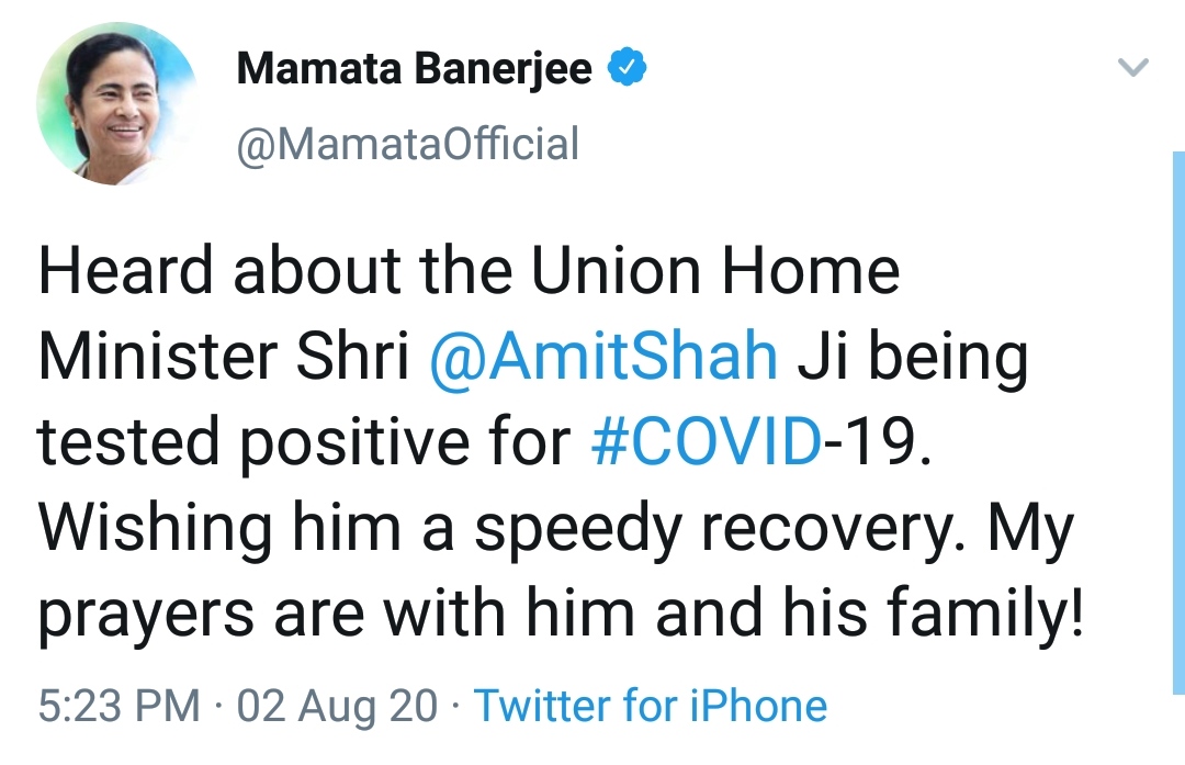 এদিকে, এই খবর জানার উদ্বেগ প্রকাশ করেন বাংলার মুখ্যমন্ত্রী মমতা বন্দ্যোপাধ্যায়। তিনি স্বরাষ্ট্রমন্ত্রীর দ্রুত আরোগ্য কামনা করেছেন। এক টুইট বার্তায় মুখ্যমন্ত্রী লেখেন, “কেন্দ্রীয় স্বরাষ্ট্রমন্ত্রী অমিত শাহ জী-এর কোভিড-১৯ পজিটিভ হওয়ার কথা শুনেছি। আমি তাঁর দ্রুত সুস্থতা কামনা করি। অমিত জী এবং তাঁর পরিবারের জন্য মঙ্গল কামনা করি”।