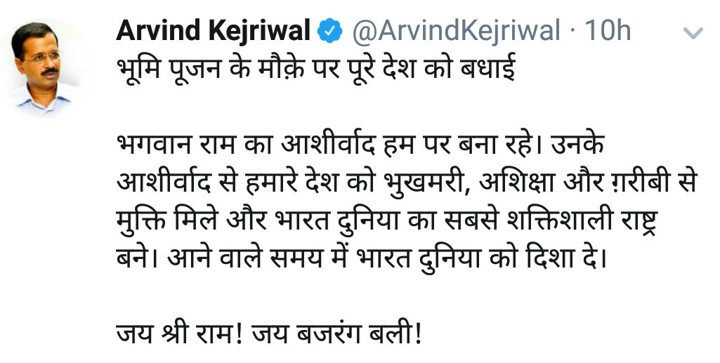 তাঁর এই টুইট দেখে রাজনৈতিক মহলের অনেকেই অবাক হয়েছেন। যেখানে রাম মন্দিরের এই ভূমিপুজোয় সক্রিয়ভাবে রয়েছেন মোদি এবং সঙ্ঘ প্রধান মোহন ভগবত, সেখানে এই অনুষ্ঠানকে কেন্দ্র করে দেশবাদীকে দিল্লির মুখ্যমন্ত্রীর শুভেচ্ছায় অনেকেই বিস্মিত।