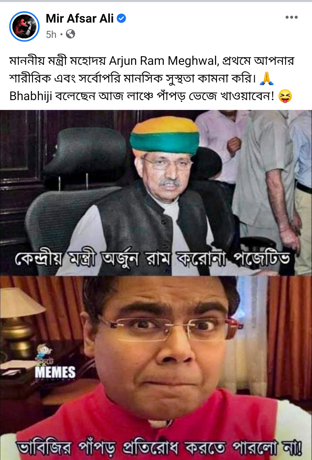 সোশ্যাল মিডিয়ায় প্রায় সাম্প্রতিক ঘটনাবলী নিয়ে পোস্ট করে থাকেন মীর। তাঁর সেন্স অফ হিউমার দেখে আপ্লুত হন নেটিজেনরা। বুদ্ধিদীপ্ত পোস্টের ফাঁকে থাকে হাসির চাবিকাঠি। এবারও তার ব্যতিক্রম হলো না। সোশ্যাল মিডিয়ায় তিনি একটি পোস্টে লিখেছেন, “মাননীয় মন্ত্রী মহোদয় অর্জুনরাম মেঘওয়াল, প্রথমে আপনার শারীরিক এবং সর্বোপরি মানসিক সুস্থতা কামনা করি। ভাবিজি বলেছেন, আজ লাঞ্চে পাঁপড় ভেজে খাওয়াবেন।” মেঘওয়ালের ছবির উপরে লেখা অর্জুনরাম মেঘওয়াল করোনা পজেটিভ। মীরের ছবির উপরে লেখা, “ভাবিজির পাঁপড় প্রতিরোধ করতে পারল না।”