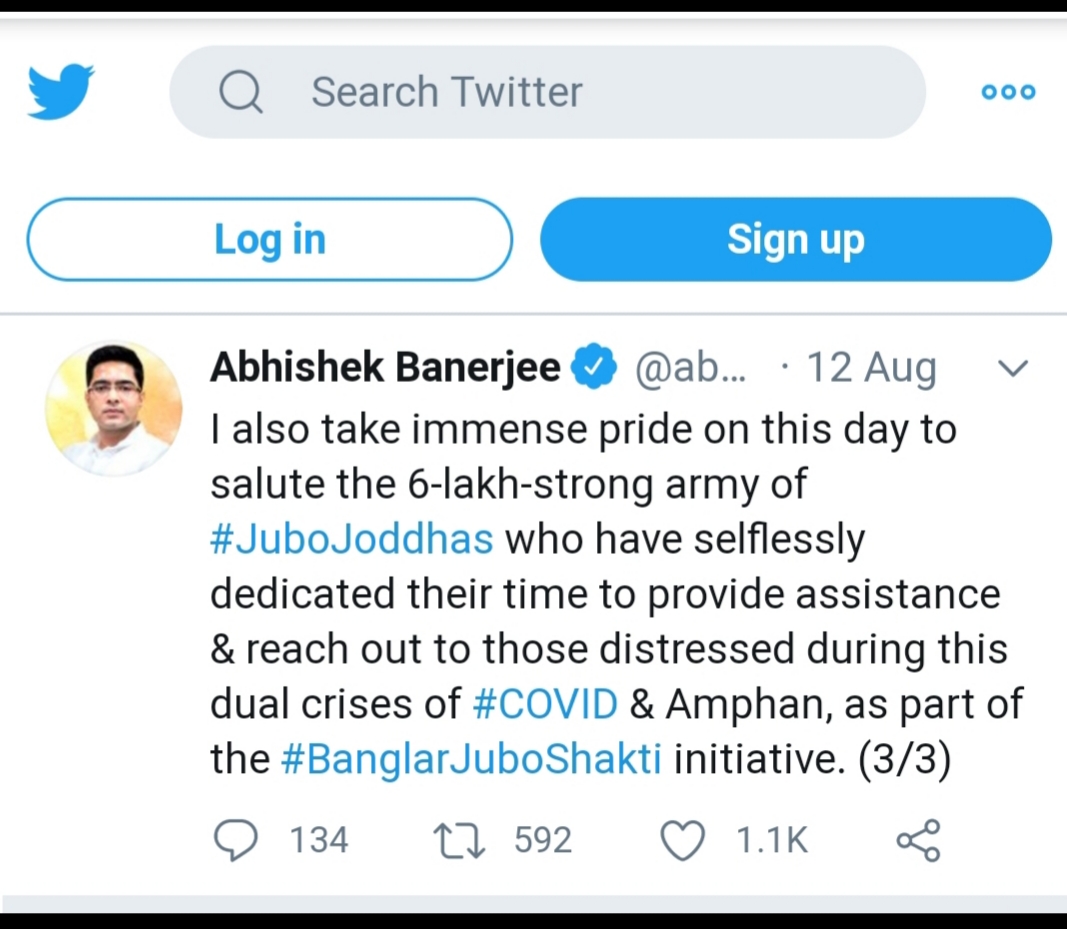 এই বিশেষ দিনে অভিষেক বন্দ্যোপাধ্যায় কোভিড এবং আমফান পরিস্থিতিতে যেভাবে ‘বাংলার যুব শক্তি’ এগিয়ে এসে উন্নয়নের কাজে হাত বাড়িয়েছে সেজন্য 6 লাখ যুবযোদ্ধাকে কুর্নিশ জানান।