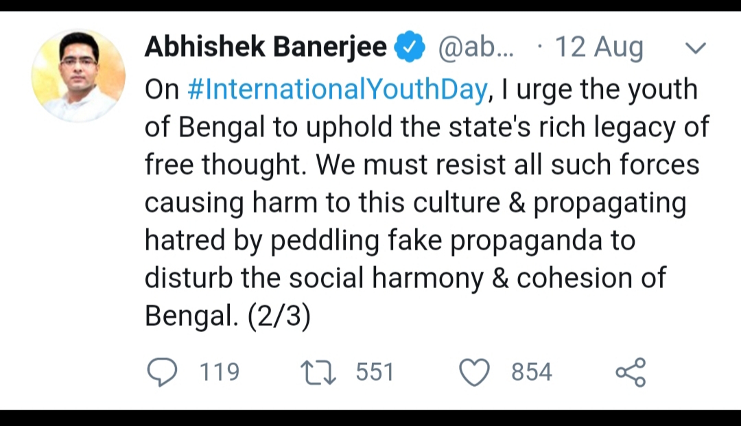বাংলার যুব সম্প্রদায়কে রাজ্যের মুক্তচিন্তা ঐতিহ্যকে বজায় রাখার আহ্বান জানান অভিষেক।
