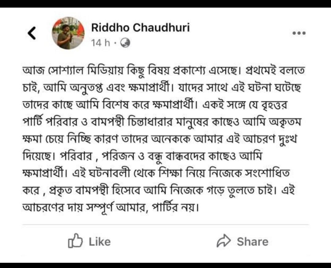 অভিযোগকারিণী ওই পোস্টগুলি ব্যাপক শেয়ার হয়েছে সোশ্যাল মিডিয়ায়। একের পর এক অভিযোগ সামনে আসতেই ক্ষমা চান ঋদ্ধ চৌধুরী। সব ভুল স্বীকার করে ফেসবুকে পোস্ট করেন তিনি। পাশাপাশি নিজের ভুল থেকে শিক্ষা নেওয়ার কথাও বলেন ঋদ্ধ। এতে আরও চটেছেন নেটিজেনরা। এদিকে ক্ষমাপ্রার্থনার পরে অবশ্য ফেসবুকে আর খুঁজে পাওয়া যাচ্ছে না ঋদ্ধ চৌধুরীর প্রোফাইল। এই বিষয়ে ডিওয়াইএফআই রাজ্য সম্পাদক শায়ন দীপ মিত্র বলেন, ” সোশ্যাল মিডিয়ায় পোস্ট দেখেছি। তবে সোশ্যাল মিডিয়া দেখে কোনও সিদ্ধান্ত নেওয়া যায় না। বিন্দুমাত্র কোনও অপরাধ থাকলে ব্যবস্থা নেওয়া হবে।” গোটা বিষয়টিতে চাপের মুখে পড়েছে সিপিআইএম। যদিও এই বিষয়ে আলিমুদ্দিন কী ব্যবস্থা নিচ্ছে তা এখনও স্পষ্ট নয়।