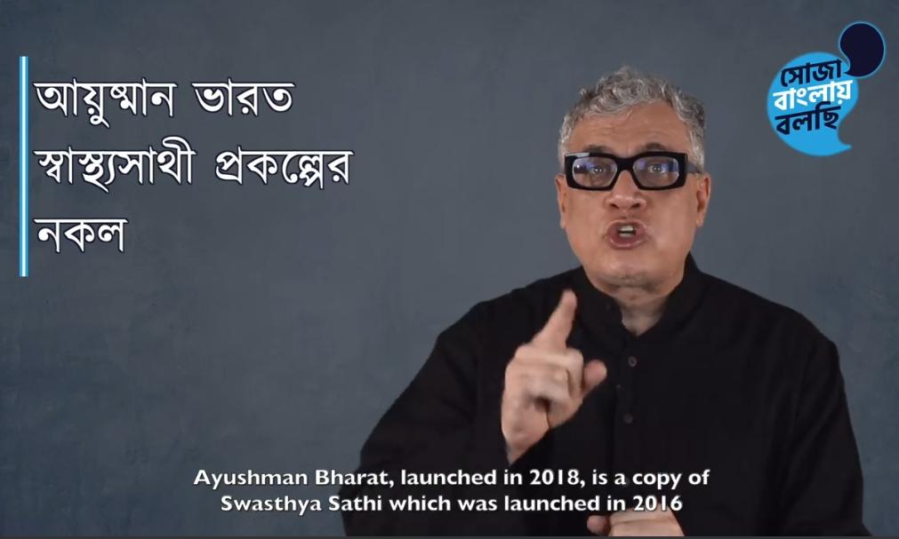 কেন্দ্রের যে আয়ুষ্মান ভারত প্রকল্প নিয়ে প্রধানমন্ত্রী নরেন্দ্র মোদি থেকে শুরু করে বিজেপি নেতৃত্ব প্রচারে ঢাক বাজান সেটা আসলে রাজ্য সরকারের স্বাস্থ্যসাথী প্রকল্পেরই নকল। সোজা বাংলায় জানালেন তৃণমূল সাংসদ ডেরেক ও ব্রায়েন। শুক্রবারের পরে রবিবার তৃণমূলের ভার্চুয়াল প্রচার ‘সোজা বাংলায় বলছি’-র দশম পর্ব প্রচারিত হয়। সেখানে তৃণমূল সাংসদ ডেরেক ও’ব্রায়েন জানান, ২০১৮ সালে কেন্দ্র আয়ুষ্মান ভারত প্রকল্প চালু করে তা ২০১৬ সালে রাজ্যে চালু হওয়া স্বাস্থ্য সাথী প্রকল্পের নকল। তৃণমূল সাংসদ বলেন, দুটোতেই পাঁচ লাখ টাকা পর্যন্ত চিকিৎসা পাওয়া গেলেও স্বাস্থ্যসাথী পুরোপুরি বিনামূল্যে অনলাইনে উপলব্ধ। কিন্তু আয়ুষ্মান ভারত প্রকল্পে রাজ্যগুলিকে মোট খরচের ৪০% দিতে হয়। এছাড়া, স্বাস্থ্যসাথী প্রকল্পে রাজ্য সরকার আর কী কী সুবিধা দেয় তাও দশম এপিসোডে জানান ডেরেক।