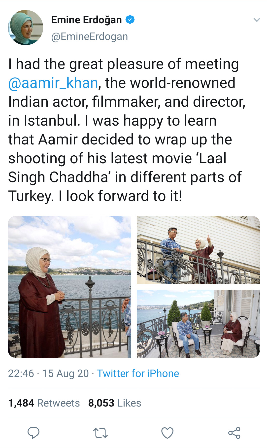 তুরস্কের ফার্স্ট লেডি তাঁর অফিসিয়াল টুইটার অ্যাকাউন্টে আমির খানের সঙ্গে তাঁর সাক্ষাতের বেশ কয়েকটি ছবি পোস্ট করেছেন। তিনি লিখেছেন, “ইস্তানবুলে বসে বিশ্বের অন্যতম পরিচিত অভিনেতা,পরিচালক আমির খানের সঙ্গে দেখা করার সৌভাগ্য হয়েছে। জেনে খুশি হয়েছি, আমির খান তাঁর ছবি লাল সিং চাড্ডা শুটিং তুরস্কের বিভিন্ন জায়গায় করবেন।”