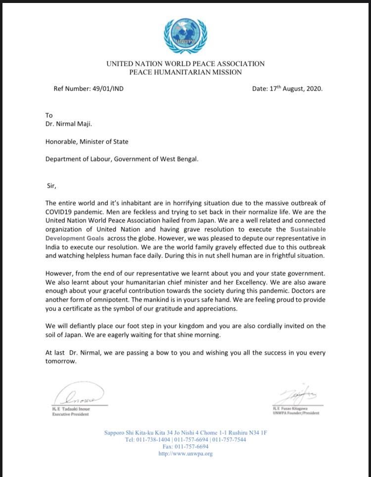 জাপানে অবস্থিত ইউনাইটেড নেশন ওয়ার্ল্ড পিস অ্যাসোসিয়েশনের পক্ষ থেকে একটি ই-মেল করে ‘সিম্বল অফ গ্র্যাটিটিউড’-এর বার্তা দেওয়া হয়েছে। রাজ্যের মন্ত্রী তথা রোগী কল্যাণ সমিতির সভাপতি নির্মল মাজিকে পাঠানো হয়েছে ওই ই-মেল। সেই বার্তায় জানানো হয়েছে, করোনা মোকাবিলায় আপনারা মানবদরদী হয়ে কাজ করছেন। মানবজাতি আপনাদের হাতে নিরাপদ। আপনাদের হাতে শংসাপত্র তুলে দিতে পেরে আমরা গর্বিত। ইউনাইটেড নেশন ওয়ার্ল্ড পিস অ্যাসোসিয়েশনের পক্ষ থেকে রাজ্যের প্রতিনিধিদের জাপানে আমন্ত্রণও জানানো হয়েছে। এছাড়াও করোনা যোদ্ধা হিসেবে আন্তর্জাতিক সম্মান পাচ্ছেন নির্মল মাজি।