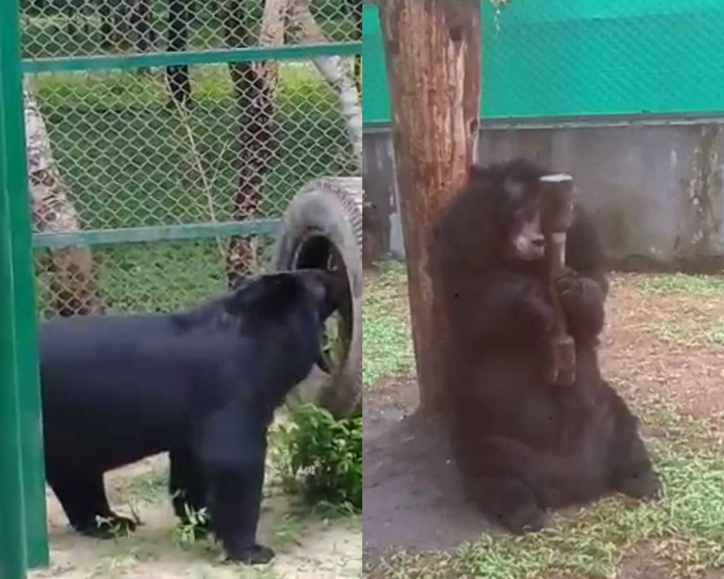 লকডাউনে শিলিগুড়ির বেঙ্গল সাফারি পার্কের দুই ভাল্লুক-ভাল্লুকি ধ্রুব আর জেনিফারের কাণ্ডকারখানা দেখলে ভাল লাগতে পারে। দুজনেই শরীর ঠিক রাখার জন্য সকাল থেকে নানা কসরৎ করছে। অনেকে বলতে পারেন, ওয়ার্ক আউট করছে। জেনিফার যেমন সকাল থেকে কাঠের ডাম্বেল নিয়ে ব্যস্ত। সে নিজেকে ঠিক রাখতে নানা ভাবে ডাম্পেল নিয়ে কসরৎ করেছে।