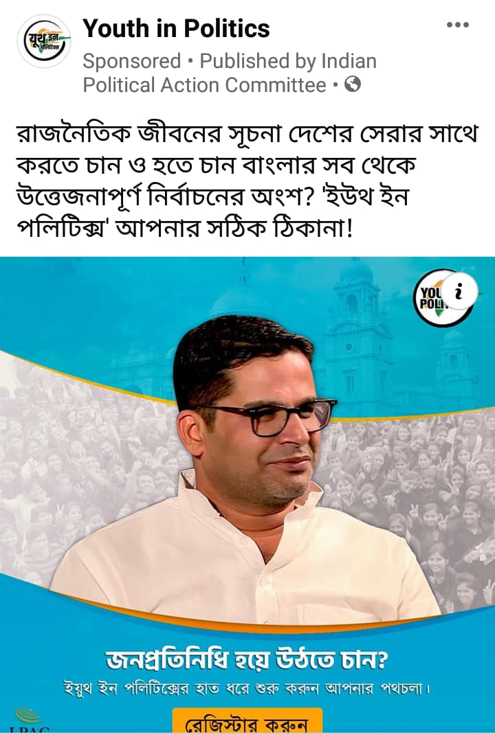 একটি ফেসবুক পেজ চালু করে৷ রাজনীতিকেই কেরিয়ার গড়ার বার্তা বার্তা দেওয়া হয় এই পেজে৷ ১৮ থেকে ৩৫ বছরের যুবক-যুবতীরা রাজনীতিতে যোগ দেওয়ার আবেদন করেছেন এই পেজের মাধ্যমে৷ সেই সব আবেদন ঝাড়াই-বাছাই করে একঝাঁক নতুন মুখকে রবিবার নিয়োগ করা হবে দমদমের একটি প্রেক্ষাগৃহে। সূত্রের খবর, এই কর্মসূচিতে থাকার কথা উত্তর ২৪ পরগনা জেলা তৃণমূলের সভাপতি জ্যোতিপ্রিয় মল্লিক ও যুব সভাপতি দেবরাজ চক্রবর্তীর৷ মূলত একুশের বিধানসভা ভোটকে সামনে রেখেই প্রশান্ত কিশোরের এই উদ্যোগ৷