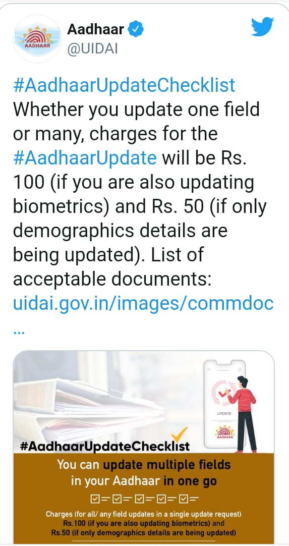 টুইটে বিস্তারিতভাবে বলা হয়েছে, আধার কার্ডে একটি বা একাধিক বায়োমেট্রিক সংশোধন করতে এবার থেকে দিতে হবে ১০০ টাকা৷ আর